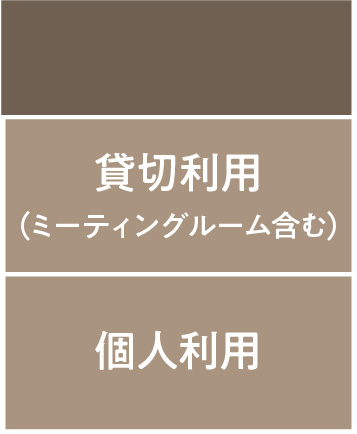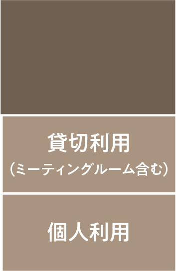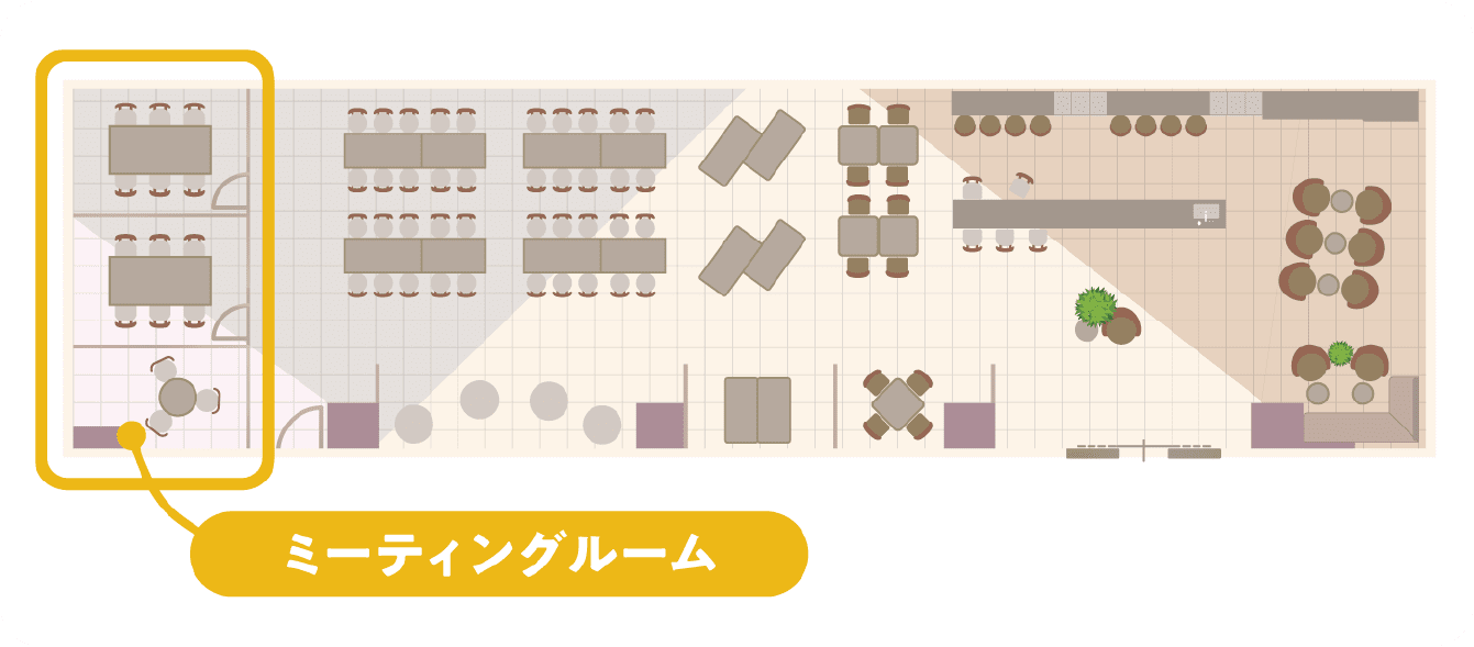 ソシオスクエア1F東側に位置し、コワーキング、少人数ミーティング、商談、セミナーなど